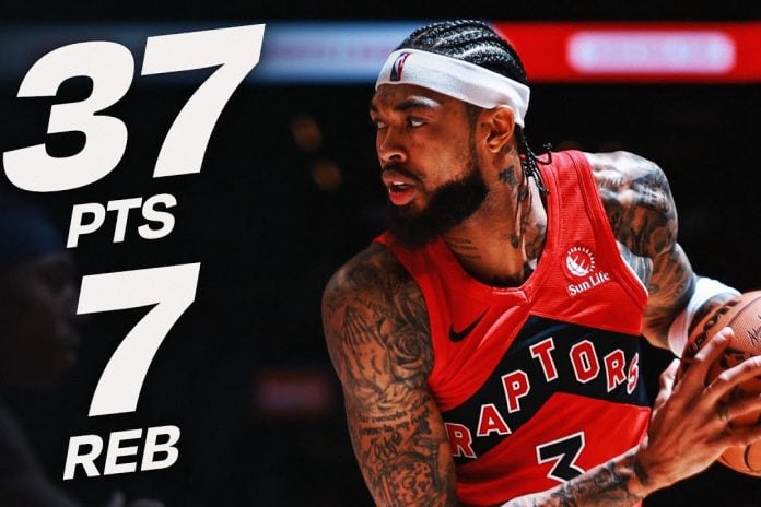 Brandon Ingram poured in a season-high 37 points, including 15 in the third quarter, to lead the Toronto Raptors to a 110-99 victory over the Cleveland Cavaliers on Monday night at Scotiabank Arena. Scottie Barnes added a double-double with 18 points and 11 rebounds as Toronto extended its winning streak to eight games.