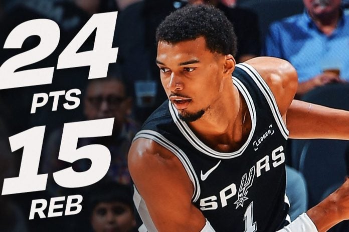 Victor Wembanyama recorded 24 points and 15 rebounds to lead the San Antonio Spurs to a 121-103 victory over the Toronto Raptors on Monday at Frost Bank Center. The win improves the Spurs to 4-0, matching their best start in franchise history.